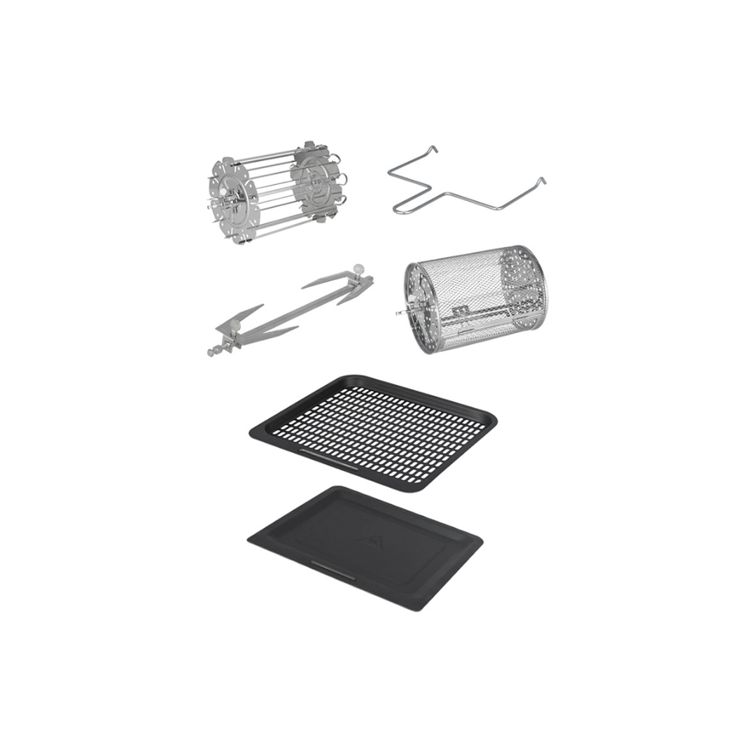 مرفقات ملائمة مريحة: عزز تجربة الطهي الخاصة بك مع الملحقات الإضافية، بما في ذلك سلة الشواء الدوارة والشوكة والرافعة وعمود الشواء الدوارمع صينية شبكية وصينية التنقيط، مما يوفر أقصى قدر من المرونة والراحة لابداعاتك في الطهي.
